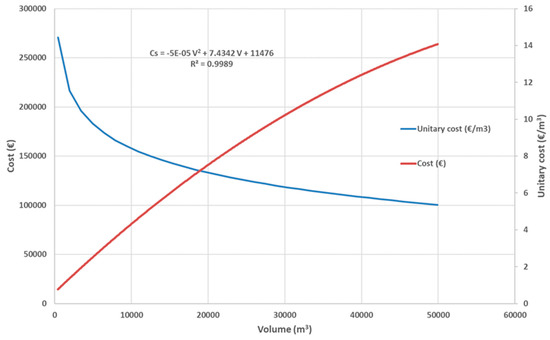 For the storage tank, a reservoir constructed of excavated natural earth and lined with a plastic sheet was considered. The cost function of this type of reservoir was obtained by fitting unitary cost data provided by an experienced consulting company (see Figure 4).