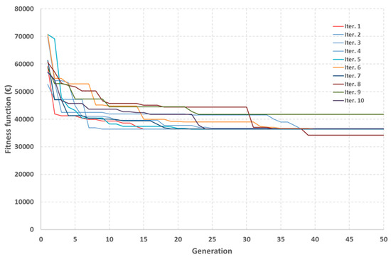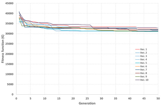 The GA analysis performed in this first stage yielded the results shown in Figure 5 and Table 3. Figure 5 shows the evolution of the fitness function for ten iterative simulations. Convergence was quickly reached and the optimal fitness function value (optimal cost) ranged from a minim value of 34,142.2 € to a maximum of 41,731.7 €. The average minimum cost in the ten runs was 36,726.3 € with a coefficient of variation of 5.2%.