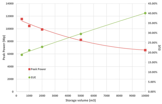 As discussed before, EUE is low, which implies that much of the potential PV energy is wasted because the tank is often full due to low storage capacity. The EUE could be increased if the storage capacity were increased. To illustrate this scenario, we simulated the system performance for increased values of storage capacity. For each storage value, we determined the minimum required peak power of the PV plant and the EUE was then calculated. Figure 7 depicts these relationships. It can be seen that as the storage volume increases from 420 m3 (economically optimal design), the peak power of the PV plant decreases and the EUE rises. To illustrate this effect, for a storage capacity of 10,000 m3, the peak power of the plant reduces almost half its value for 420 m3 and EUE increases up to 40%.
