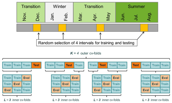 Sketch of the nested cross-validation protocol used for hyperparameter tuning and error estimation for the scenario of four measurement periods, randomly selected from the whole measurement period (November 2016–September 2017). With these four selected periods, an outer K-fold cross-validation () for the estimation of the generalization error and an inner L-fold cross-validation () for the hyperparameter tuning are performed.