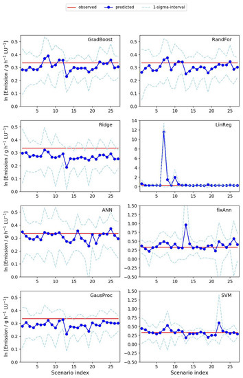 In Figure 2, the logarithm of the average predicted emissions over the ten-month period for the 27 basic scenarios (Table 1) is shown. Results are averaged over the 30 random realizations for each scenario; the light blue dashed lines show one-sigma intervals over these random realizations. The horizontal red lines show the logarithm of the average true emissions over the ten months observed in the data ( = 1.406 g h−1 LU−1). In row 1, the results of the ensemble methods (gradient boosting and random forest) are shown; these two results are almost identical. In row 2, the results of linear regression with regularization (Ridge, left) and without regularization (LinReg, right) are shown. These results are very different from each other. For the linear regression case without regularization, many points are out of any reasonable range, particularly when only one day per measurement period is used. The results of the other scenarios, particularly those with six measurement periods, are more comparable to the results of the scenarios in row 1 and are considerably closer to the true ten-month averaged value. In principle, with regularization, the linear regression shows the same behavior as the ensemble methods when changing from one scenario to another, but all mean values are below the observed value. In row 3, the results for an artificial neural network with hyperparameter tuning (ANN, left) and a simple neural network with one hidden layer and four nodes (fixAnn, right) are shown. The predictions of the more complex ANN are generally much closer to the experimental value, and the variance is much lower than with the simplified version. The prediction of the fixAnn approach is, however, comparable to and in many cases better than that of the linear regression. In row 4, the predictions of the Gaussian process model (GaussProc, left) and the support vector machine (SVM, right) are shown. The variance of the Gaussian process is the lowest of all methods, but all mean values are below the experimental value. The predictions of the SVM are in most cases better than those of the simple neural network and the ordinary linear regression, but worse than those of the gradient boosting, random forest, Gaussian process, complex ANN, and ridge regression.