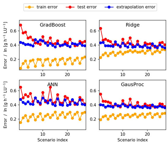Comparison of mean absolute error (all in ln [g h−1 LU−1]) for the four best-performing regression methods. The mean values of training (orange) and test error (red) from the cross-validation are compared. In addition, the extrapolation error (blue) of the retrained model for the data disjoint from the training and test sets is shown for comparison. All error values depict averages over 30 random selections of training data in agreement with the scenario constraints.