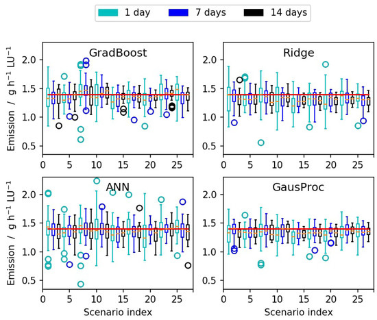 Predicted average emissions (in g h−1 LU−1) for the four best-performing regression models. The average values and the variability based on the 30 random realizations are shown as box plots for the different scenarios. The red lines show the average emission value (1.406 g h−1 LU−1) that was observed in the complete experimental dataset. The lengths of the measurement periods of the individual scenarios are color-coded.