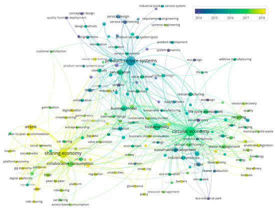 To further exemplify the relationships between the research paradigms and verify whether they stand alone and, if not, how they are interconnected, we produced a network of terms that co-occurred in different publications. We extracted the bibliographic information from the publications in Scopus on ‘circular economy’, ‘sharing economy’, ‘collaborative consumption’, and ‘product-service systems’. Then, we used the software VOSViewer (version 1.6.13) [41] to generate the term map. Figure 1 below shows the network of co-occurrence of the terms’ appearance in the title, abstract and authors’ keywords. The size of the circles represents how frequently the terms appear, whereas the proximity of two circles indicates how often they appear together (the colours are designated by a Natural Language Processing algorithm). We can see a pattern where three clusters are clearly visible and they are unified by the concepts ‘business model’, ‘innovation’, and ‘sustainability’. Moreover, the oldest cluster is product-service systems, whereas sharing economy is the most recent one. Understandably, a simplified view of the relationships between the paradigms may not include the intricate and complex nature of and within each paradigm. However, we select such a perspective only for the purpose of a pragmatic classification of the literature so as to begin a systematising research agenda among the research communities involved in these areas, which we hope will spark discussion and further contribution.