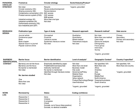 In the study, an initial classification scheme was developed to extract the key information available stated in the abstracts regarding the barriers, such as which research paradigm they related to, type of circular strategy they addressed, type of research, methods used, etc. Figure 2 below shows an overview of the meta-data, outcomes, and contextual information that was considered to be relevant based on the study objectives. A summary of conceptual definitions is shown in Appendix A. Each category was represented by a column in the shared working sheet. Some of the categories were predefined and some were grounded in an organic approach, e.g., country or analytical perspectives of the research. For example, given the diversity of research contributions, we could have not known in advance the sector, industry, or product category (if any), hence, data were extracted organically as reading progressed. Furthermore, during the extraction of information for different types of circular strategies, some abstracts would refer to multiple concepts, e.g., remanufacturing and reuse or recycling and B2B, and these have been classified as “more than one type” to avoid double counting.
