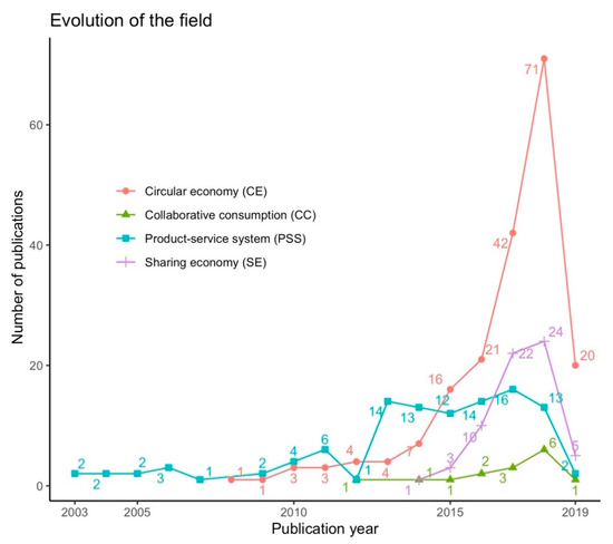 Evolution of the publications on barriers to CE, CC, PSS and SE. The data refer to publications on Scopus up to 23 January 2019.