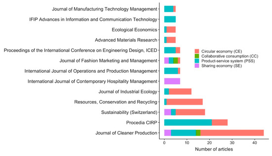 Figure 4 below presents the spread of article publications in different sources. Notably, the Journal of Cleaner Production (n = 44) attracted most publications from the publications included. The journals Sustainability (Switzerland) (n = 18), Resources, Conservation, and Recycling (n = 17), as well as the Journal of Industrial Ecology (n = 12) are included. Meanwhile, for conferences, two channels seem to be of the utmost relevance for publications, Procedia CIRP (n = 28) and Proceedings of International Engineering in Design (ICED) (n = 7). The rest of the publication channels contained less than five articles published and hence are not shown in the figure. The distribution of publications is spread across a wide variety of channels, demonstrating the variability of the research topics and areas of application in CE, SE, CC, or PSS.