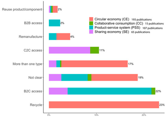 Publications that addressed, for example, a C2C sharing platform and B2C access in the same paper were classified as “more than one type of strategy”. Of the articles included for mapping, 17% contained more than one strategy, and this was predominantly observed in papers under the circular economy paradigm or the sharing economy paradigm. Interestingly, 19% of papers were not clear in the type of strategy they addressed, and this was prevalent among all the paradigms noted. One explanation is that the papers addressed the paradigms in general terms as a whole and not any particular subset, or these were not specified in the abstracts. However, the lack of specification in cases where this was possible may create further complexity in reaching literature conclusions. For example, a B2B remanufacturing approach can have a completely different supply chain compared to a B2C reusing approach.