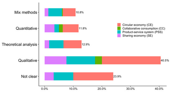 The research approach and type of studies in all the abstracts screened are diverse, and mixed methodologies seem to be widespread across the literature for all the four paradigms. Figure 6 shows that a qualitative research approach is the dominant one, comprising 40.5% of studies, among which the majority of papers are empirical studies, followed by systematic literature reviews. Only 12.9% of studies employ a quantitative research approach, and these are predominantly empirical studies, whereas 10.8% of studies use a mixed-method approach with a majority of articles also being empirical studies. Interestingly, quantitative studies are considerably low among product-service systems favouring a more mixed method approach. However, in 23.9% of abstracts, the research approach was not clear or not directly implied. Hence, we classified them through our own inference of type of study in which we distinguished between conceptual, empirical, literature reviews or not clear at all. Even so, inferring the methodological approach from the abstract was evidently unclear, considerably affecting the mapping process and consequently the analysis.