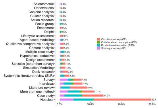 Similarly, in terms of the research methods used, Figure 7 shows 29.7% of abstracts lacked an indication of the type of method used and hence were classified as not clear. This can create challenges for systematic mapping since lack of specification can jeopardise the selection process for further evaluation and analysis in systematic literature reviews. On the other hand, in 14.2% of the abstracts, the research method employed is a case study. In 11.1% of the abstracts, more than one method was used to conduct the study, followed by literature reviews (8.9%), interviews (7.4%), and surveys (7.1%); other methods were also present within the literature (see Figure 7). The results show that case studies constitute the largest portion (14.2%) of identified research methods, which can indicate that the generalisation of findings needs to be viewed with caution. In addition, this demonstrates the need for a clear communication of the study approach, methodology, and methods in the abstracts relating to CE, SE, CC, and PSS in order to enable a better analysis of studies and their implications.