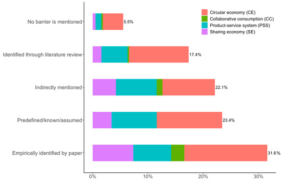 During the mapping process, the objective was to distinguish how barriers are understood and identified in the literature, hence we classified where barriers were the core focus of publications and where they were not the core focus. As seen in Figure 8 below, 120 (31.6%) publications identified barriers empirically through case studies, or other qualitative and quantitative research methods. In contrast, 89 (23.4%) publications identified barriers through assumptions, by generalising knowledge or based on predefined problems by other scholars. For example, several abstracts discussed the barrier of user acceptance towards a circular strategy, assuming that this is a true barrier and building the entire research design around this assumption, while relatively few papers attempted to validate this through empirical evidence or other approaches. In 66 (17.4%) publications, barriers were identified through literature reviews, including both systematic literature reviews and background studies. In the majority of the publications, barriers were the main focus in relation to CE, PSS, SE, or CC. However, regardless of whether the keyword search was specified to include only publications related to barriers, hinderances, and challenges alike, 84 (22.1%) abstracts did mention barriers but did not directly study the barrier(s). After the mapping was complete, another 21 (5.5%) publications were identified as not addressing any barrier per se, although they did contain the keywords. A similar pattern distribution can also be observed when we further break down the data and show all the subset strategies categorised within CE, SE, CC, and PSS.