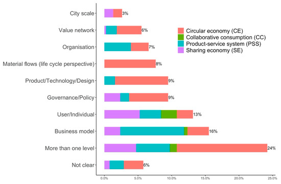 In terms of the context of the barriers, studies can be distinguished by different levels of analysis. Figure 9 below shows that 24.2% of the abstracts studied barriers in relation to more than one variable or were difficult to classify into one category, hence, these were classified as containing more than one analytical perspective. Barriers in relation to the business models were found in 15.5% of abstracts. In 13.2% of abstracts, barriers were related to the user or individual context such as consumer behaviour, adoption, acceptance, or experiences with regard to CE, SE, PSS, or CC, regardless of what strategy the papers were addressing. In 9.5% of the abstracts, governance or policy barriers together were found, and 9.5% of the papers contained barriers in relation to products, technologies, or the design of these. In the rest of the abstracts, barriers were related to material flows (7.6%), organisational barriers (6.6%), and barriers in value networks (5.5%), which were initially expected to be much higher given the complexity of organising for circular or sharing systems. However, these can also be identified using the business model perspective since value networks, organisation, and material flows can be considered as part of the business models as well.
