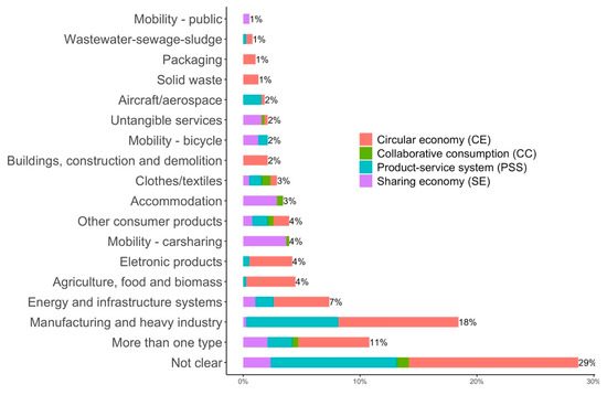 Studies could also be classified with regard to barriers being experienced within different sectors, industries, or product categories. This was of particular interest in order to understand whether similar patterns of obstacles could be traced across different industrial activities. This category was organic as the reading progressed, due to the diverse nature of the studies. The results in Figure 10 show that within the four paradigms, barriers are experienced across different sectors and industries as identified by research. In 18% of the abstracts, barriers situated in or related to manufacturing and heavy industry were found. Energy and infrastructure systems barriers were found in 7%, and this was followed by transport and mobility, among others, as shown in Figure 10 below. Even when coding for a specific industry such as mobility, for example, studies differed between types of mobility, e.g., car sharing, bicycle sharing, public transport, and more. However, 29% of the abstracts were categorised as unclear, whereby the abstracts either did not mention the type of sector, industry, or product, or such specification was not possible due to the nature of the study. Most abstracts were not explicit in this regard, and interpretations were made based on all the available information. Despite this, the percentage coded as unclear remains high, which may imply that studies, although highly case based (as shown above), lack specification of the study approach, making it challenging to explore barriers in industry-specific aspects or a product-specific context. Another 11% of the abstracts were also categorised as ‘more than one type’ meaning they were cross-industry studies, combined sectors, or multiple products.