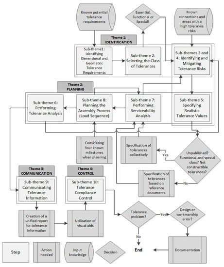 Like TM in manufacturing [64], the improvement of TM in construction requires a process that must involve all of the TM stages [4,15,17,20,24,25,38]. Nevertheless, the holistic view of TM has hardly been considered in the current construction management literature. It is evident from Table 1 that only one process [20] for TM in construction could be found that covers all the identified stages (i.e., IDENTIFICATION, PLANNING, COMMUNICATION, CONTROL). In [20]’s effort to propose a process for TM, tolerance theories used in manufacturing are adopted to construction.