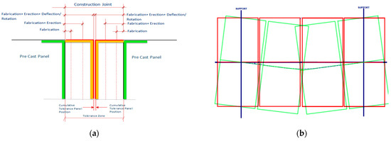 (a) Visualisation of the sources of deviations affecting a joint between pre-cast concrete panels; (b) arrangement of pre-cast panels before and after being subjected to sources of variations (adopted from Tolerance and Deflection Report of Project B).