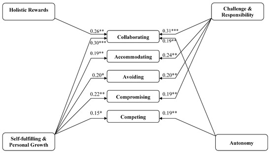 The means and correlations of all variables are reported in Table 2, and in general, the correlations reveal expected relationships and provide confidence that the measures functioned properly for the effects tested in this study (please refer to Table 2). The regression results are reported in Table 3 and Figure 1 (please refer to Table 3 and Figure 1). As shown in Table 3 and Figure 1, the results clearly indicate that the group-oriented work values, such as the needs for holistic rewards, are significantly related to win-win or integrative approaches (β = 0.26, p < 0.001), while the self-oriented work values, such as the need for self-fulfillment and personal growth, the need for challenge and responsibility, and the need for autonomy, are significantly related to win-lose or distributive approaches: Both the need for self-fulfillment and personal growth and the need for challenge and responsibility have a significant impact on accommodating (β = 0.19, p < 0.01; β = 0.24, p < 0.001, respectively), on avoiding (β = 0.20, p < 0.01; β = 0.20, p < 0.01, respectively), on compromising (β = 0.22, p < 0.01; β = 0.19, p < 0.01, respectively), and both the need for self-fulfillment and personal growth and the need for autonomy have significant impact on competing approach (β = 0.15, p < 0.05; β = 0.19, p < 0.01, respectively), in support of H1 and H2. While meaningfulness was not found related to any conflict management style, it is worthwhile to point out that the results also showed the need for self-fulfillment and personal growth, the need for challenge and responsibility, and the need for autonomy are also significantly related to collaborating style in resolving work-related conflicts with coworkers (β = 0.30, p < 0.001; β = 0.31, p < 0.001; β = 0.19, p < 0.01, respectively).