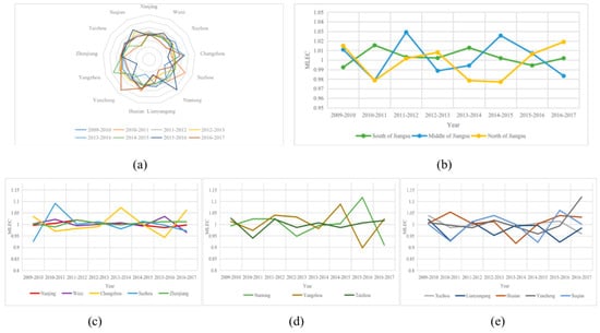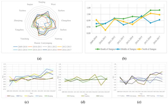 The results of the average annual EC indexes are presented in Table 3 for the whole sample period. Figure 5 demonstrates year-on-year changes of the 13 prefecture-level cities and the South Jiangsu, Middle Jiangsu, and North Jiangsu zones concerning the EC indexes. Figure 5a shows the EC indexes of 13 prefecture-level cities, and Figure 5b shows the average annual EC indexes of the South Jiangsu, Middle Jiangsu, and North Jiangsu. Figure 5c–e compares the EC indexes of the prefecture-level cities in the South Jiangsu, Middle Jiangsu, and North Jiangsu, respectively.