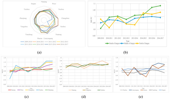 The results of the average annual TC indexes are presented in Table 2 for the whole sample period. Figure 4 demonstrates year-on-year changes of the 13 prefecture-level cities and the South Jiangsu, Middle Jiangsu, and North Jiangsu zones concerning the TC indexes. Figure 4a shows the TC indexes of 13 prefecture-level cities, and Figure 4b shows the average annual TC indexes of the South Jiangsu, Middle Jiangsu, and North Jiangsu. Figure 4c–e compares the TC indexes of the prefecture-level cities in the South Jiangsu, Middle Jiangsu, and North Jiangsu, respectively.