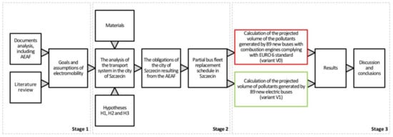 The rest of this paper is organized as follows. Section 2 includes a review of the literature on the aspects raised in the article. The problem of air pollution is discussed with particular emphasis on urban areas, and the issue of electromobility is introduced. Section 3 describes the research material and indicates the applied methods. It presents a diagram showing the course of research divided into individual stages. Section 4 includes information related to electromobility assumptions in the EU and Poland and legal conditions for the implementation of electromobility, with particular emphasis on requirements stipulated in AEAF. Section 5 was devoted to the characteristics of the research area—the city of Szczecin and the analysis of its transport system, including the analysis of the condition and structure of the bus fleet currently used in public transport in the city. The analysis covered aspects necessary for the calculations carried out in Section 6 and therefore relating to the emission standard. This part of the article also presents the amount of pollution generated by buses deployed in urban transport in Szczecin. Section 6 presents the case study of the city of Szczecin. It presents the research results on the volume of pollutant emissions generated by combustion buses as well as zero-emission buses, projected up to the year 2035, and taking into account the character of the energy management in Poland. For illustration, the results were presented in the form of charts, and the detailed data were presented in the form of the tables. Finally, Section 7 is devoted to the discussion of the produced results and conclusions.