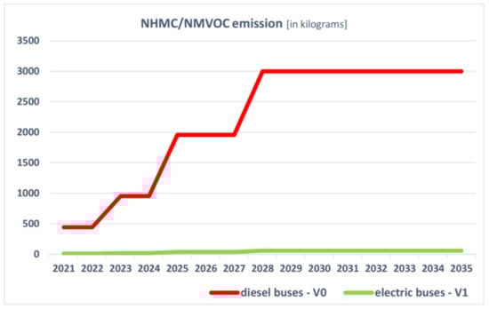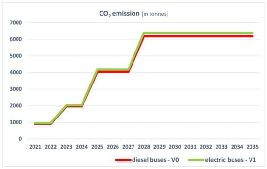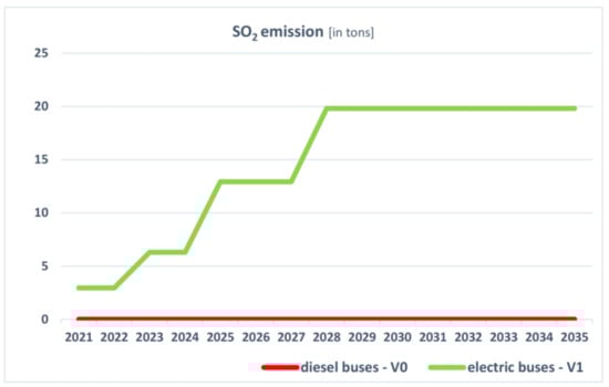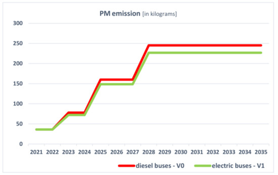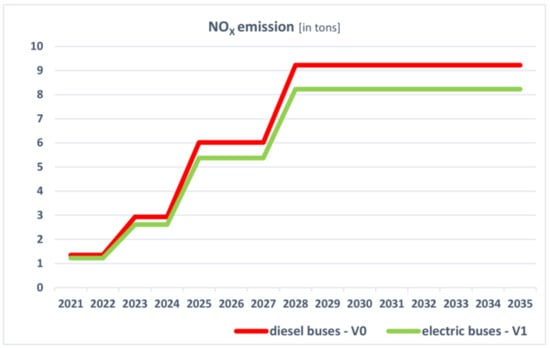 During the course of the research, the amount of pollution generated by the buses used in public transport in Szczecin was calculated. The summary of the results was presented in Table 2. The data show that the problem related to pollution generation by public transport is relevant for the city of Szczecin. In order to reduce the emission of harmful substances and increase the quality of life for the city dwellers, including the protection of their health, and following the AEAF provisions, the city must take measures to replace the bus fleet with vehicles that have a less negative influence on the environment and people. Section 6 presented the results of the conducted research taking into account two options for the city: partial replacement of the fleet with vehicles that currently comply with the highest emission standard EURO 6 (V0) or partial replacement of the fleet with electric vehicles and the environmental effects resulting therefrom (V1).