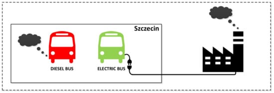 The main purpose of the article was to identify and analyze environmental effects resulting from the implementation of zero-emission buses in urban public transport on the example of the city of Szczecin. In the course of the study, the assumptions were made regarding the type and number of implemented zero-emission vehicles, in accordance with the provisions adopted by the Polish parliament in Act of 11 January 2018 on Electromobility and Alternative Fuels (AEAF) []. The area of research was the city of Szczecin, Poland. The research was conducted according to the data as of the end of the year 2018, projected up to the year 2035.