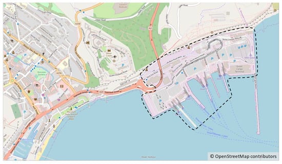 The focus of the current study is the Port of Dover in the UK. The Port of Dover is Europe’s busiest ferry port, handling upwards of £119 billion or 17% of the UK’s annual trade in goods along a 180 km trade expressway [25]. As a roll-on-roll-off (aka ro-ro) ferry port, the Port of Dover faces multiple challenges with managing the flow of over 10,000 vehicles per day to/from mainland Europe. Ferry operations are situated on the Port’s Eastern Docks, which are constrained geographically to a small area bounded by cliffs to the north, the sea to the east and south, and the town of Dover and major road links to the west (Figure 1). What is more, the Port operates in a highly dynamic environment. This includes both short-term operational stressors (e.g., delayed ferry movements caused by storms, variable staffing levels, labor strikes, and heightened security in response to acts or threats of terrorism) and long-term strategic stressors (e.g., projected growth of freight traffic and the possibility of additional border and customs checks on vehicles following Brexit). With little recourse to increase its existing footprint, it is vital that the Port finds smarter ways of doing things if it is to maintain and grow the ferry business.