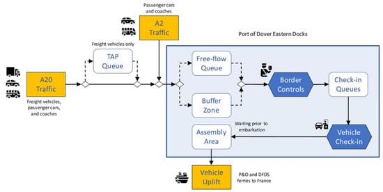 - Preston, C.; Horne, P.; O’Hanley, J.; Scaparra, M.P. Traffic modelling at the Port of Dover. Impact 2018, 1, 7–11. [Google Scholar] [CrossRef]