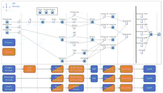 The Port system is moderately complex, with multiple traffic types, arrival rates which have within-day, weekly, and seasonal variations, and a series of manned check points, each of which is preceded by space for queuing traffic (Figure 2). The Port is best thought of as a “system of systems” [31], in which the overall behavior of the system emerges from the interactions among its component processes and queues.