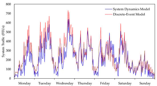 Comparison of number of vehicles in the Port system, measured in freight equivalent units (FEUs), for the systems dynamics model and the discrete-event simulation model given inputs for a typical week. The Pearson correlation coefficient for the two time series displayed is 0.94.