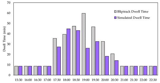 Comparison of simulated dwell times in the TAP queue with observed dwell times from BlipTrack during a TAP event on the evening of 2 February 2016.
