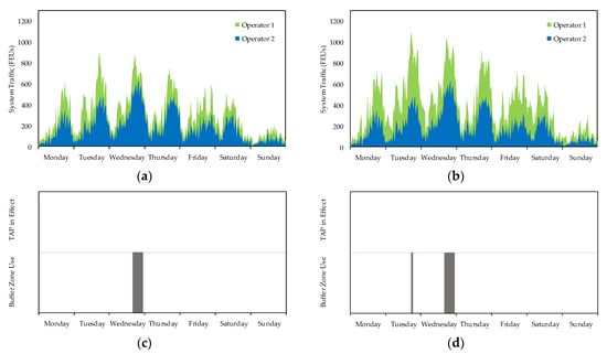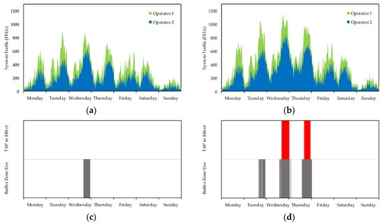 (a) Simulated Port traffic by ferry operator (blue and green) over a typical week under baseline conditions and (b) following a 10% increase in freight traffic, along with (c) buffer zone (grey) and TAP use (red) under baseline conditions and (d) following a 10% increase in freight traffic.