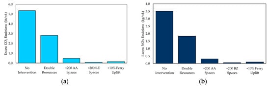 (a) Excess CO2 emissions per week and (b) excess NOx emissions per week for potential interventions to manage 10% growth in freight traffic. Note that CO2 emissions are measured in kilotons (kt) per week, while NOx emissions are measured in kilograms (kg) per week.