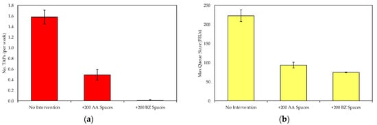(a) Expected number of TAPs per week and (b) maximum size of the TAP queue for the no intervention, add space to the assembly area (AA) and add space to the buffer zone (BZ) planning scenarios in response a 10% growth in freight traffic.