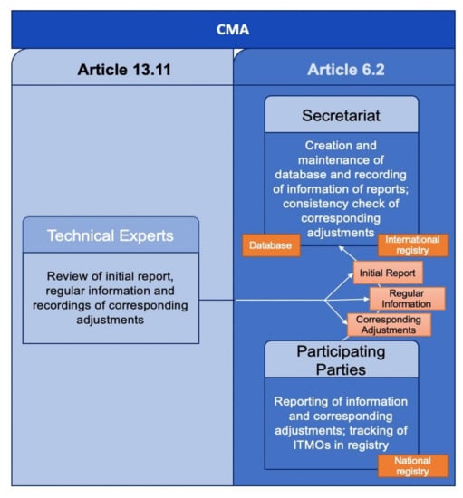 To use a blockchain system, it is not necessary to develop a new system, but rather to use a blockchain to interconnect with the existing systems. Over APIs, Ethereum and Hyperledger Fabric can be interlinked with existing system architectures [39,79]. Under the Kyoto Protocol, countries already established national registries and the UNFCCC has the existing knowledge and technology to create and manage databases and registries [80]. Furthermore, according to the current status, it is desired by the Conference of the Parties of the Paris Agreement (CMA) to further use national registries and a database as system infrastructure [4]. The blockchain would be used as a process layer, interconnecting the existing system parts, and ensuring immutability, consistent states, and transparency.