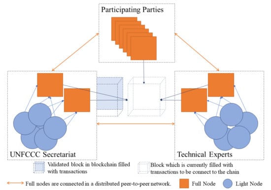 The UNFCCC secretariat has to date around 450 staff members [67]. These members do not all execute tasks in the scope of Article 6.2. Hence, two full nodes should be sufficient to ensure continuous connection to the network and to maintain a second record copy in case of node failure. Each full node could be connected to several light nodes of UNFCCC secretariat members. To estimate the number of necessary nodes for the technical experts, we resort to the experience from the Kyoto Protocol [68]. Similar to the process under the Kyoto Protocol, we expect that the secretariat selects 150 technical experts. The task of these experts is to review ITMO documentation of the participating Parties. These reviews are either carried out remotely or in-country at the project level. There are two lead reviewers to guide the reviewers. Using the most complex scenario, it is assumed that a final validation has to be done by one of these two reviewers, who are representing the technical experts. Due to their important role in the network, each lead reviewer should have a full node. The remaining 148 experts could access and transfer relevant data via a light node. This makes it possible for the review teams to handle transactions at the project implementation level. At the time of writing, 187 of 197 Parties have ratified the Paris Agreement [69]. Calculating each European country separately results in 214 countries. Each Party needs a full history of all transactions and has an active role in the consensus protocol. To increase the network requirements and provide a back-up, each country could have two nodes. In total, this would make 428 full nodes. The distribution of nodes also leads to a distribution of power and ownership, as each country has equal rights and the same responsibility in the network. In the aggregate, this results in a maximum amount of 432 full nodes and 148+ light nodes (see Figure 2). The light nodes would be connected with at least one full node to send and receive transactions over the blockchain.