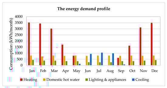The variation of the monthly consumption of the building’s utilities is shown in Figure 3. Because the structure of the on-site energy demand may vary in different moments of the day and seasons of the year, energy storage is required for the optimal operation of micro-cogeneration systems.