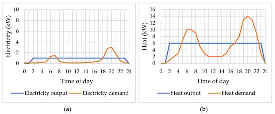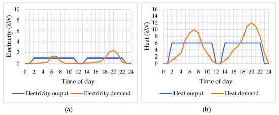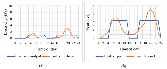 The primary sources used may also cover peak thermal demands when the load provided by the cogeneration system is insufficient. In most cases, because the demands for building utilities (heating, cooling, domestic hot water, and electricity) are not at the same time, energy storage is required. The heat storage system represents a key component for the micro-CHP systems since it permits to store the unused heat during electricity production for a later use. The micro-CHP system can primarily track heat demand by supplying electricity as a byproduct or can track electricity demand to generate electricity and use heat as a byproduct. The heat storage will allow the system to capture heat when not in use and then deliver it when the process requires more heat than the cogeneration unit can offer. Electricity storage is used for the same reasons. Depending on the particulars of household consumptions, the storage systems have been dimensioned according to the maximum duration loads to ensure at least three to four hours thermal load and at least two hours electrical load. Oversize of the storage systems can reduce the profitability of the micro-CHP system.