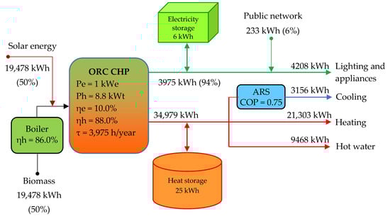 Demand for electricity will be ensured by the micro-CHP unit and the public electricity network. The electricity differences between local consumption and production are compensated without technical difficulty from the public electricity network. There is also the possibility of storing the electricity generated in cogeneration to be used according to needs. The heat storage system will be used to compensate for the load variations and for increasing the flexibility of the micro-CHP unit. Cooling requirements will be ensured from the absorption refrigeration system or compression refrigeration system depending on the heat available from the micro-CHP unit.