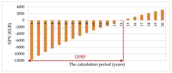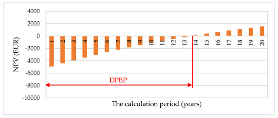The discounted payback period (DPBP) is more reliable than the simple payback period (SPBP) as it accounts for time value of money. The DPBP shows the operating period, at the end of which, through the updated cash flow generated, the investment is fully recovered and there is still the possibility of obtaining a cash flow that corresponds to the discount rate. Mathematically, the DPBP is the operating period after which NPV is null. In this case study, the DPBP is 13.62 years in the Stirling CHP case (Figure 12) and 14.25 years in the ORC CHP case (Figure 13). Figure 14 shows the influence of the specific cost of cogeneration technologies on the SPBP and the DPBP. Figure 15 shows how the price increase of natural gas and electricity affects the DPBP. Increasing the price of natural gas as a result of import dependence has the effect of reducing the profitability of the investment, while increasing the price of electricity has the opposite effect. The profitability of the investment is even greater as the difference between the price of electricity from public network and the price of the fuel used in the micro-CHP plant increases as in the case of biomass.