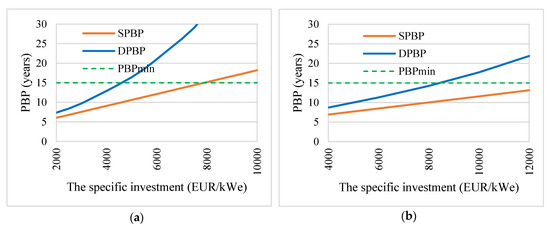 The influence of the solar energy share on the PBP in the ORC CHP case: (a) the ORC CHP (70% share of solar energy); (b) the ORC CHP (90% share of solar energy).