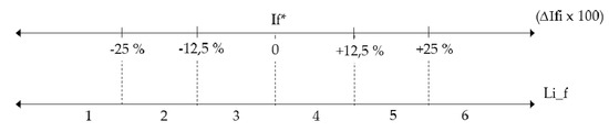 - the value of the parameter Lf is assigned on the basis of the increase and decrease in the surface index deriving from the direct survey of school spaces (internal and external) (If) with respect to the parameter of law If*. Figure 2 below shows the extremes of the incremental and decremental intervals (∆If), expressed in percentages, defined starting from the If* value and the average Li_f score to be assigned to the i-th space according to the corresponding ∆Ifi.
