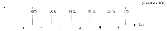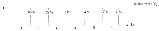 - With regard to the structural aspect, the corresponding evaluation index (Ls) is measured according to the number of rooms, used for teaching and not, distributed on each floor of the school building, which at the time of the on-site inspection are unusable and risky for the safety of school users. Figure 3 below shows the interval extremes, expressed as a percentage, established on the basis of the number of currently unusable environments (Nai) defined with respect to the total number of spaces (Ntot) present on each school level, and the average score to be assigned, according to the values scale [1,2,3,4,5,6], in descending order on the basis of the number of impassable spaces by the persons surveyed at the time of the inspection.