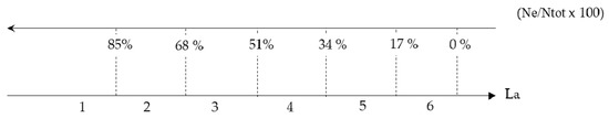 - As far as fire safety is concerned, the corresponding evaluation index (La) is measured taking into account the obligation deriving from the law (Law 81/2019) to provide each environment with appropriate fire protection devices (e.g., fire extinguishers, which are not exhaustive) with particular performance characteristics. In particular, the attribution of a high, or low, numerical value to the La index can be related to the frequency (in percentage terms) of spaces in correspondence with each floor of the school building, in which the presence, or absence, of fire extinguishers or other devices for fire risk prevention is found, compared to the total number of rooms on the same floor. Figure 4 below shows the reference diagram for the assignment of the score to the parameter (La) as a function of the frequency of the rooms without fire-fighting devices (Ne) compared to the total number (Ntot) of spaces on the i-th floor.
