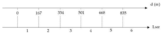 With reference, instead, to the evaluation of the congruence level between the services currently offered through the use of the internal environments of the building with those present in the analysis buffer (with a radius of 1000 m), a qualitative score from 1 to 6 is attributed to the corresponding evaluation index (Lser) according to the number of similar services found in the urban area of interest and the relative distance (included in the analysis buffer of 1000 m) measured with respect to the point where the building is located. Figure 6 shows the scale of values from 1 to 6 according to the distance of the i-th service from the school. The maximum distance is assumed to be 1000 m, as indicated in Appendix C of Circular n° 425/1967.