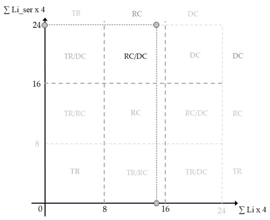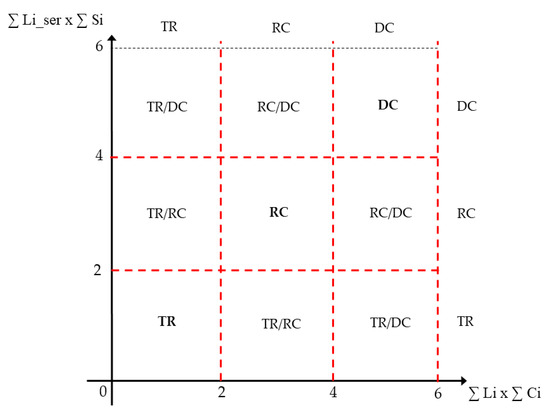 The phase of identification of the intervention modalities was carried out using the double entry diagram of Figure 7. Reporting on the x-axis the value of Kt and on y-axis Kser is defined the combination of the types of action to be implemented for the integrated requalification of the school. In this case, four types of service were considered (n° Si = 4) and four regulatory criteria were respected (n°Ci = 4). So, the extremes of the numerical intervals that identify the proposed types of intervention (TC, RC, DC) were multiplied respectively by the total number of services and technical-regulatory criteria considered.