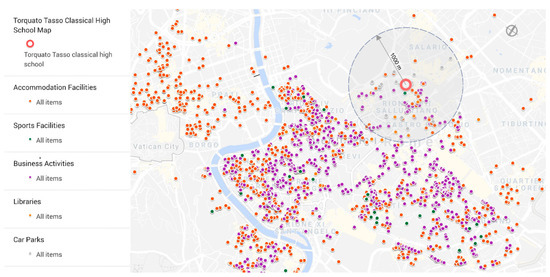 After the georeferencing of the information, an information map (see Figure 10) was created using GIS instrumentation (Google Maps) to support the identification and analysis of services within the 1000 m buffer. Through the use of this cartography, it was possible to see that the territory is characterized by the high density of commercial activities and accommodation facilities. This is due to the presence of elements with strong tourist and infrastructural attractiveness (Roma Termini railway station) that influence the market dynamics. In the analysis buffer of 1000 meters, there are no services for the community (for example, non-exhaustive, neighborhood library, headquarters for cultural associations, spaces for social gathering).