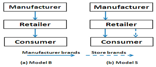 Although a large stream of research has studied the effect of substitutions from competitors on manufacturers’ green design (see, e.g., Du et al. [25] and references therein), to the best of our knowledge, little attention has been paid to whether a manufacturer should design for the environment when confronting the competition from a retailer’s store brand. Motivated by the above fundamental research question, we present two models in which the manufacturer has an incentive for designing for the environment, and a retailer has the flexibility to sell store brands (Model S), or it does not (Model N). Using these two models, we intend to answer the following research questions: