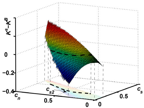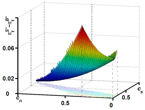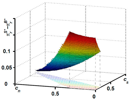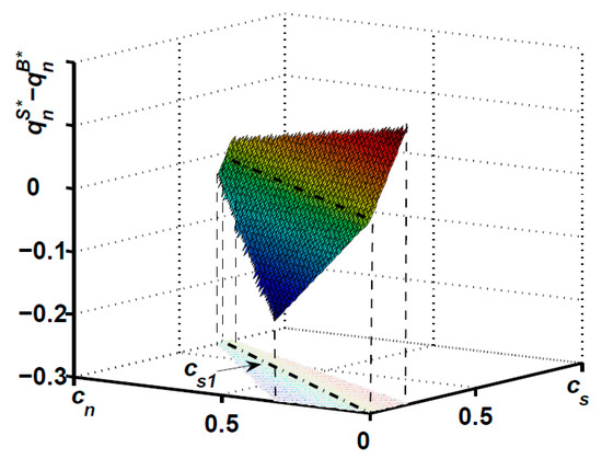 To better illustrate Proposition 2, we now compare the difference between both models in numerical experiments (Consistent with prior literature, e.g., Zhang et al. [34] and Ru et al. [45], the parameters of the level of environmental friendliness of the new greener version of the national brand and the consumer value discount for store brands are characterized by and , respectively.). Based on Figure 2, we find that there is a threshold of , above which the retailer would distribute greater quantities of national brands. That is, if the selling cost for store brands is pronounced, i.e., , the difference between the optimal number of units of national products in Model S is always greater than that in Model B, i.e., ; otherwise, .