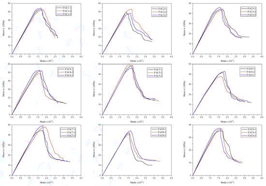 The experimental uniaxial stress–strain curves of PAC including three curves for each batch are presented in Figure 11. It could be seen that three curves for each batch had a similar shape. In order to evaluate the difference between each series of curves, the normalized mean stress–strain curves of PAC were calculated and are shown in Figure 12. This indicated that the curves for each batch could be divided into two parts: the ascent stage and the descent stage. The ascent stage and descent stage showed variability between each series. A steeper descent stage for each batch as compared to NC indicated that the brittleness of PAC was higher than that of NC [34,35,36,37]. This observation was also verified by the destruction phenomenon of cubic compressive strength tests.