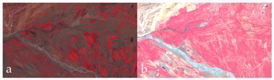 Changes in cropland in Suzak, Jalal Abad, from 1989 to 2018. Left (a): Landsat TM5 image from 30 May 1989, right (b): Landsat OLI 8 image from 3 September 2018.